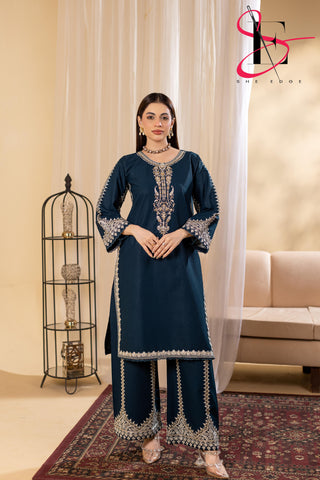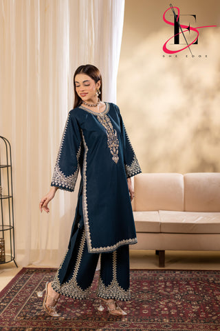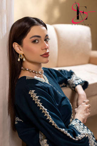 “Elevate your winter style with this embroidered three-piece suit in a dreamy blue hue. Crafted from cozy winter fabric, its intricate detailing and gracefully designed dupatta make it a timeless choice for both everyday elegance and special occasions.”