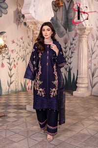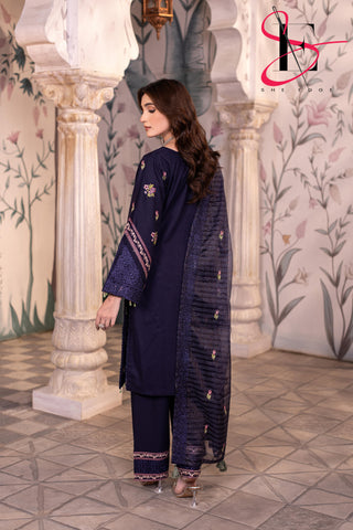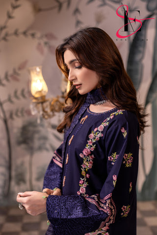 Elevate your winter style with SHE EDGE’s embroidered two-piece suit in a blue shaded color shade. Crafted from cozy winter fabric, its intricate detailing and gracefully designed dupatta make it a timeless choice for both everyday elegance and special occasions.”