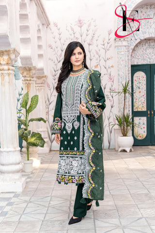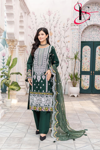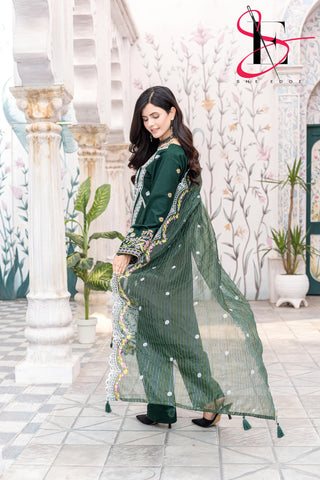 Elevate your winter style with SHE EDGE’s embroidered three-piece suit in a dreamy green color shade. Crafted from cozy winter fabric, its intricate detailing and gracefully designed dupatta make it a timeless choice for both everyday elegance and special occasions.”