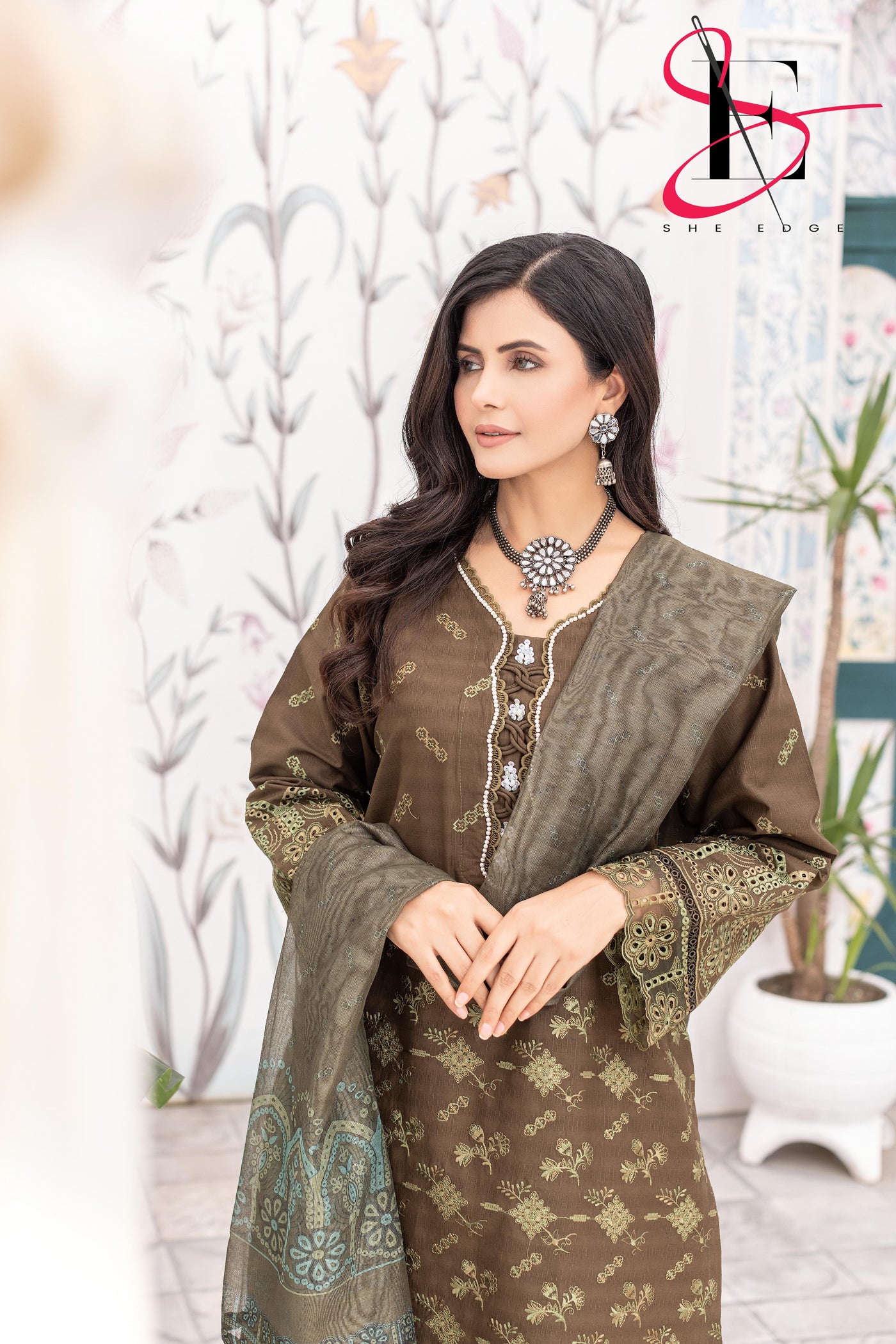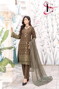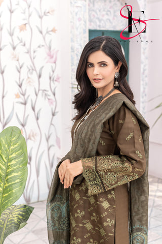 Elevate your winter style with SHE EDGE’s embroidered three-piece suit in a dreamy brown color shade. Crafted from cozy winter fabric, its intricate detailing and gracefully designed dupatta make it a timeless choice for both everyday elegance and special occasions.”