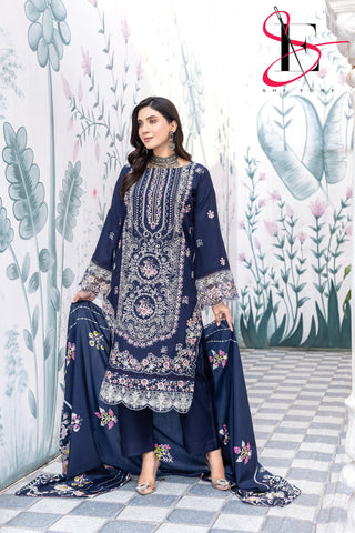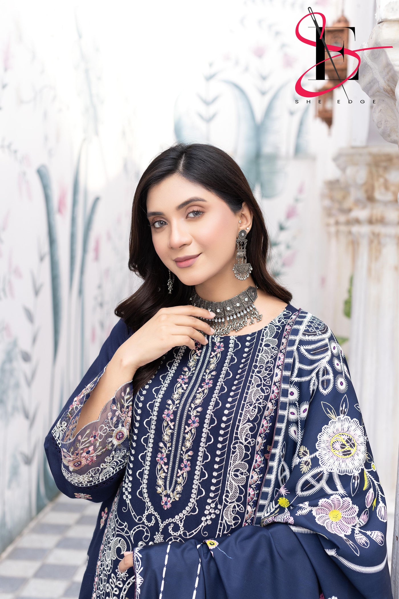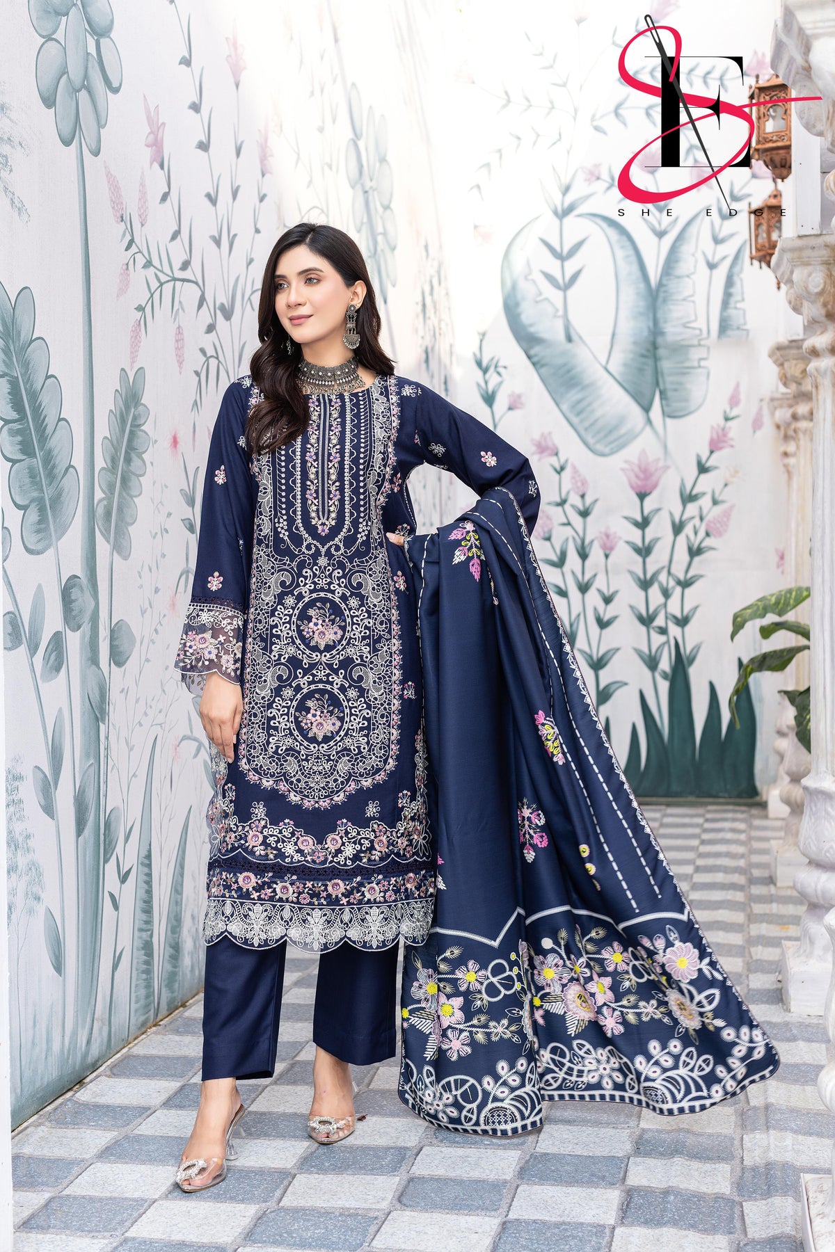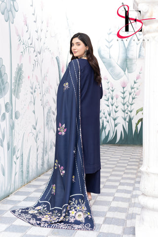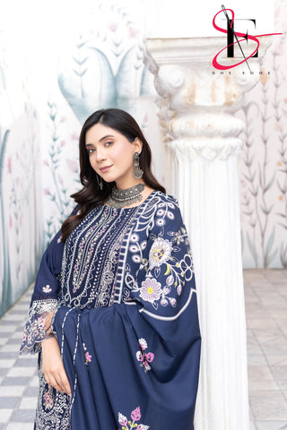 Elevate your winter style with SHE EDGE’s embroidered three-piece suit in a dreamy blue color shade. Crafted from cozy winter fabric, its intricate detailing and gracefully designed dupatta make it a timeless choice for both everyday elegance and special occasions.”