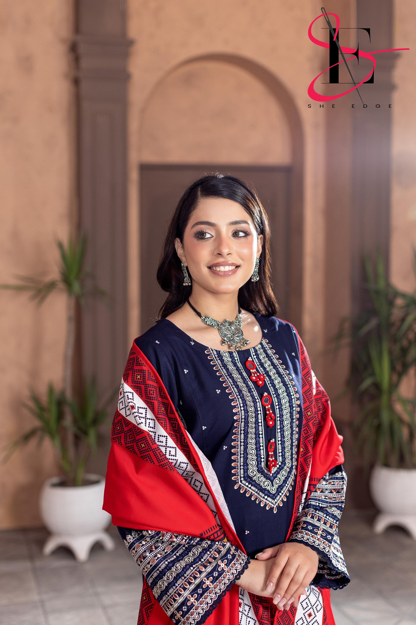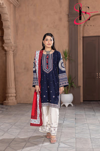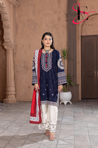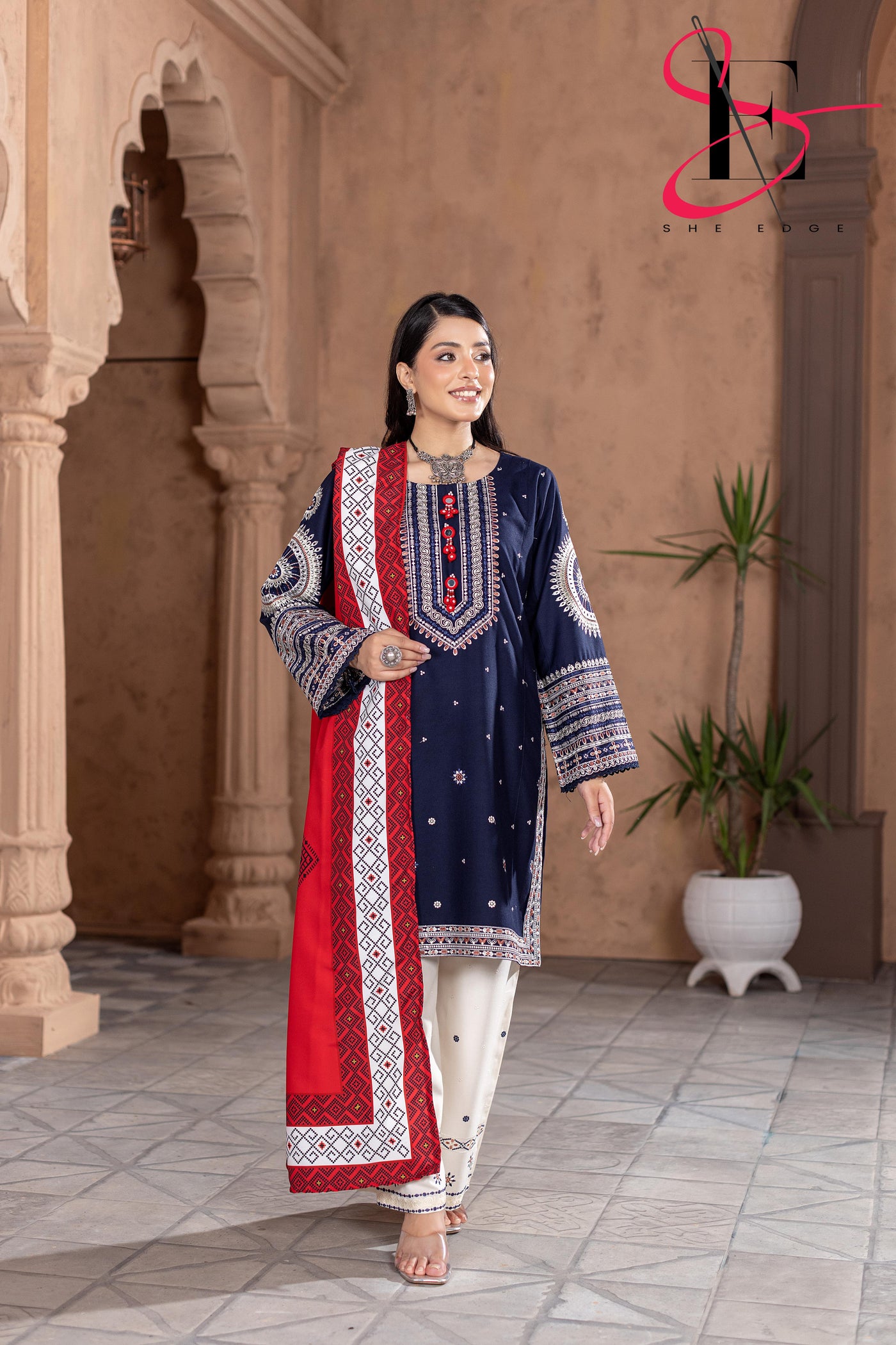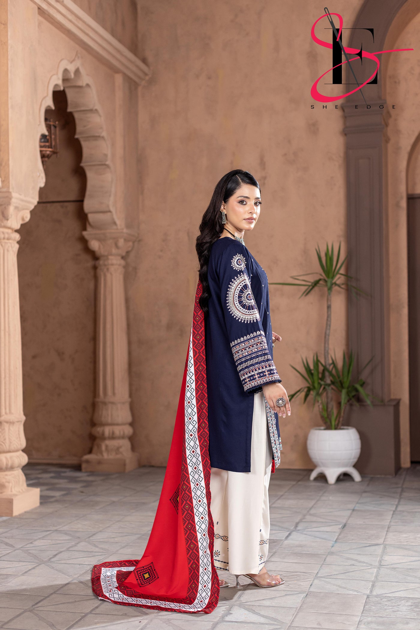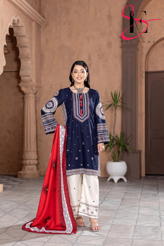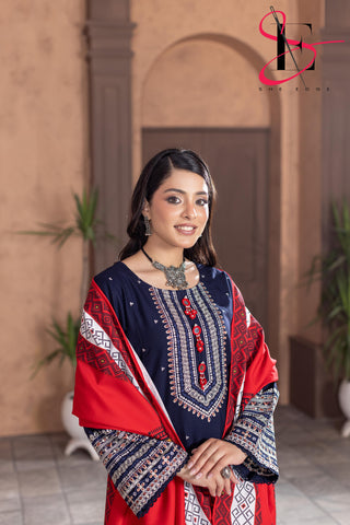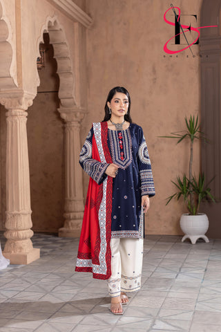 Elevate your winter style with SHE EDGE’s embroidered two-piece suit in a beauty blue color shade. Crafted from cozy winter fabric, its intricate detailing and gracefully designed dupatta make it a timeless choice for both everyday elegance and special occasions.”