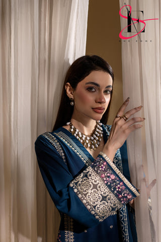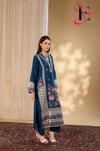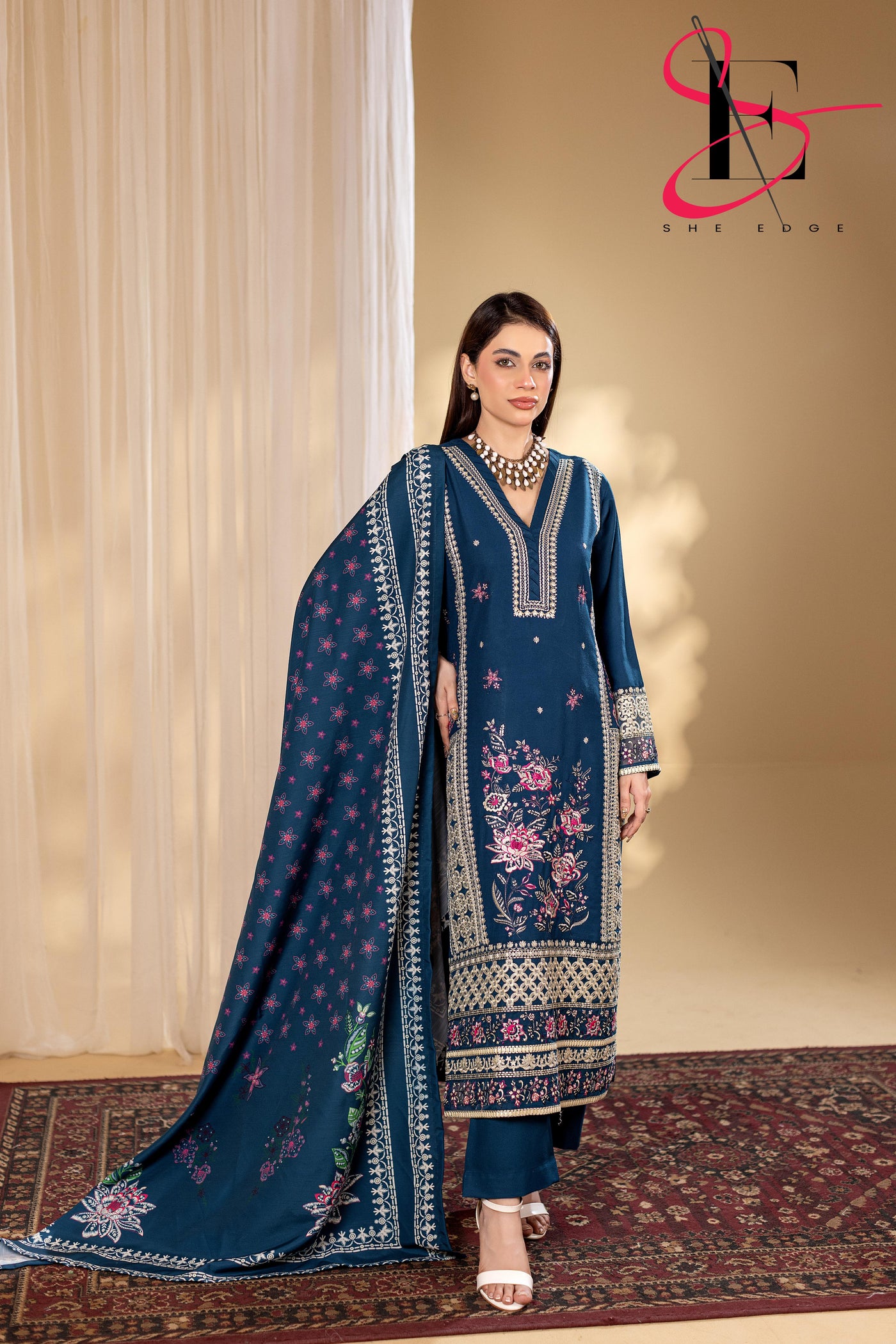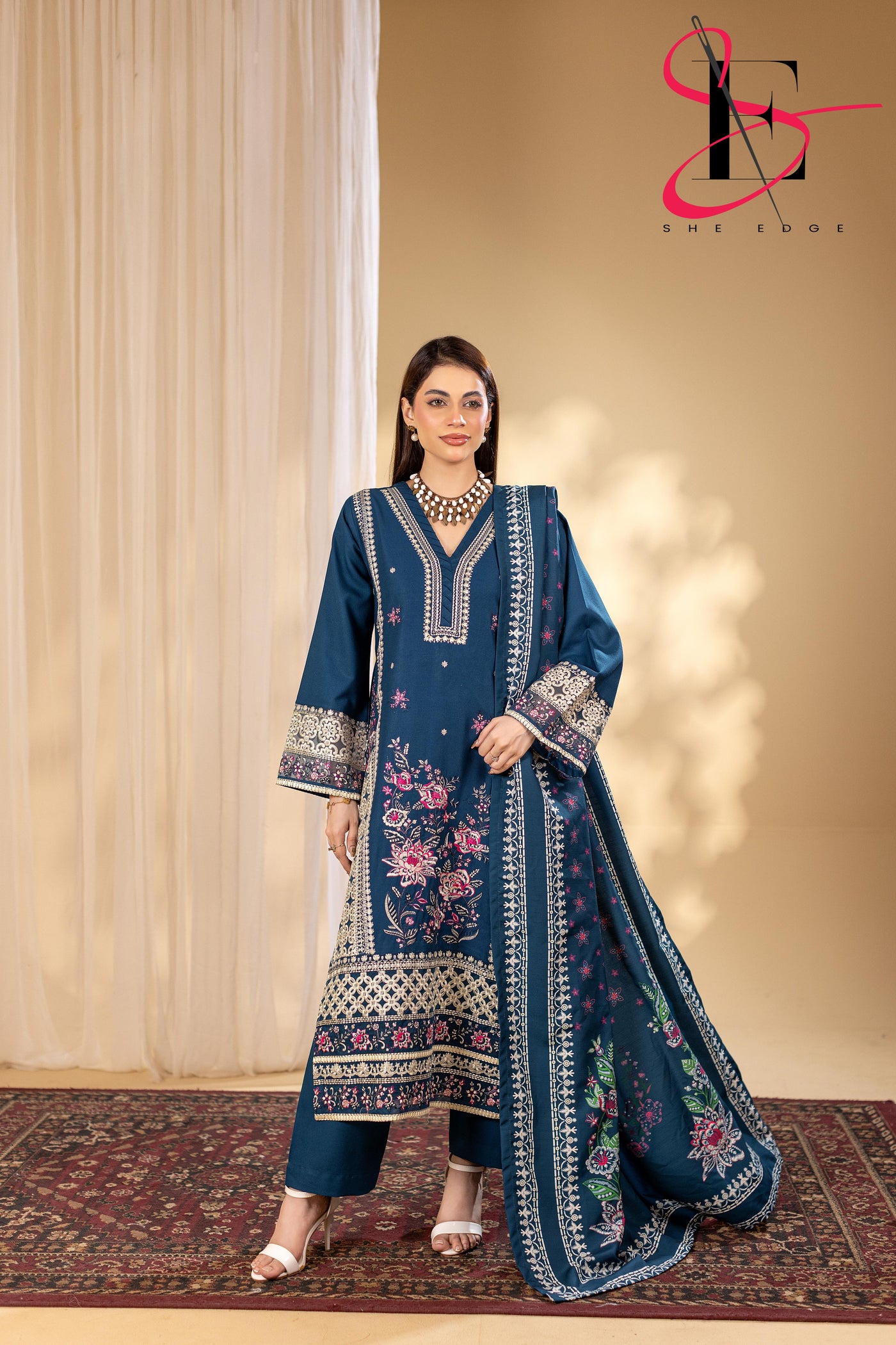 Elevate your winter style with SHE EDGE’s embroidered three-piece suit in a dreamy blue color shade. Crafted from cozy winter fabric, its intricate detailing and gracefully designed dupatta make it a timeless choice for both everyday elegance and special occasions.”