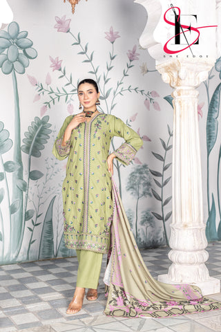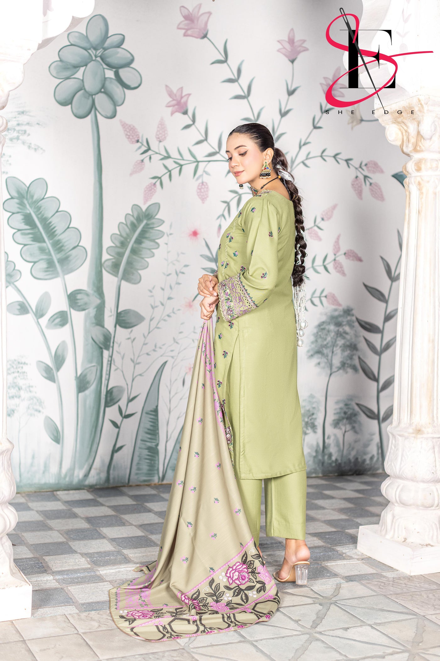 Elevate your winter style with SHE EDGE’s embroidered three-piece suit in a dreamy dhanak color shade. Crafted from cozy winter fabric, its intricate detailing and gracefully designed dupatta make it a timeless choice for both everyday elegance and special occasions.”