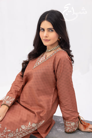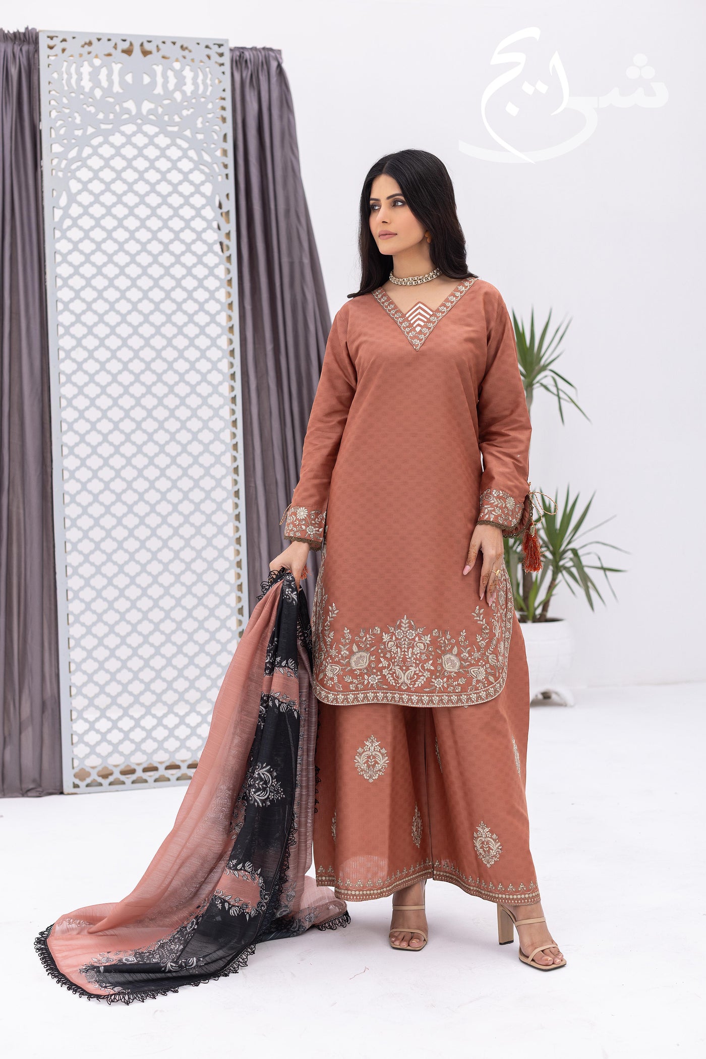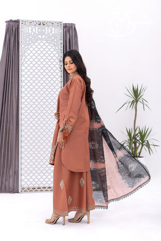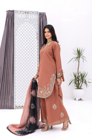 Elevate your everyday look with this standout piece from Smart Casual ’26—a trendy 3-piece stitched suit built for daily wear with a premium finish. Featuring a rich rust color palette, the outfit includes an embroidered shirt with refined detailing that keeps it clean, stylish, and easy to carry. The look is paired with a full flapper-size palazzo trouser, beautifully finished with embroidery on the bottom for that extra smart-casual polish.