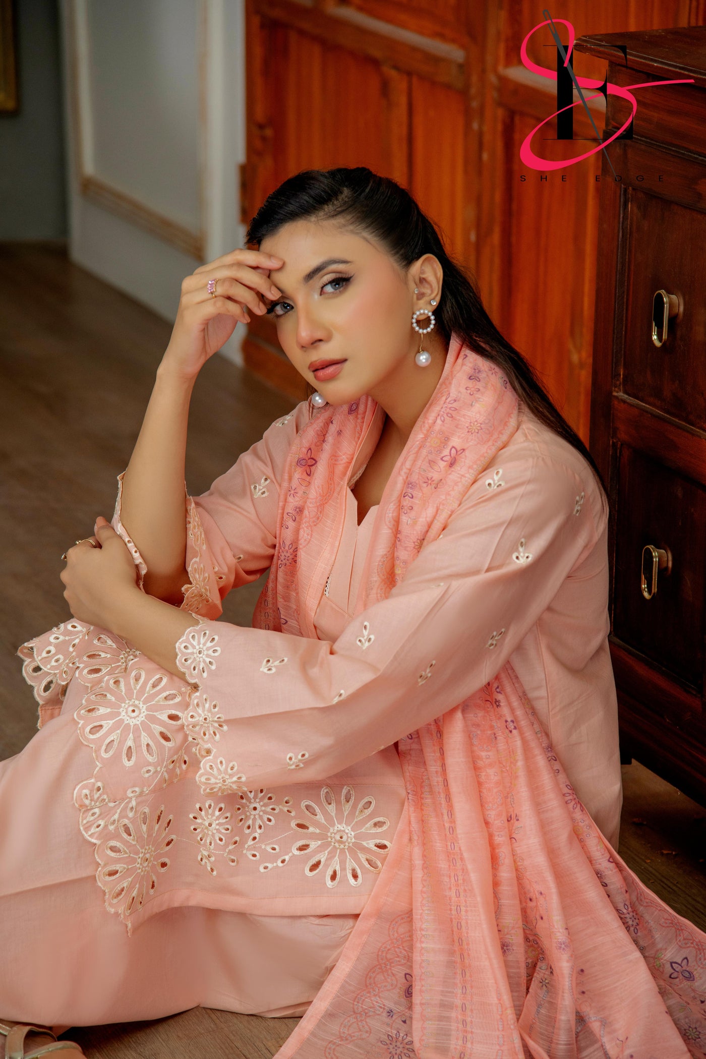 This 3-piece pink ensemble captures the essence of feminine charm with intricate detail and playful color.
