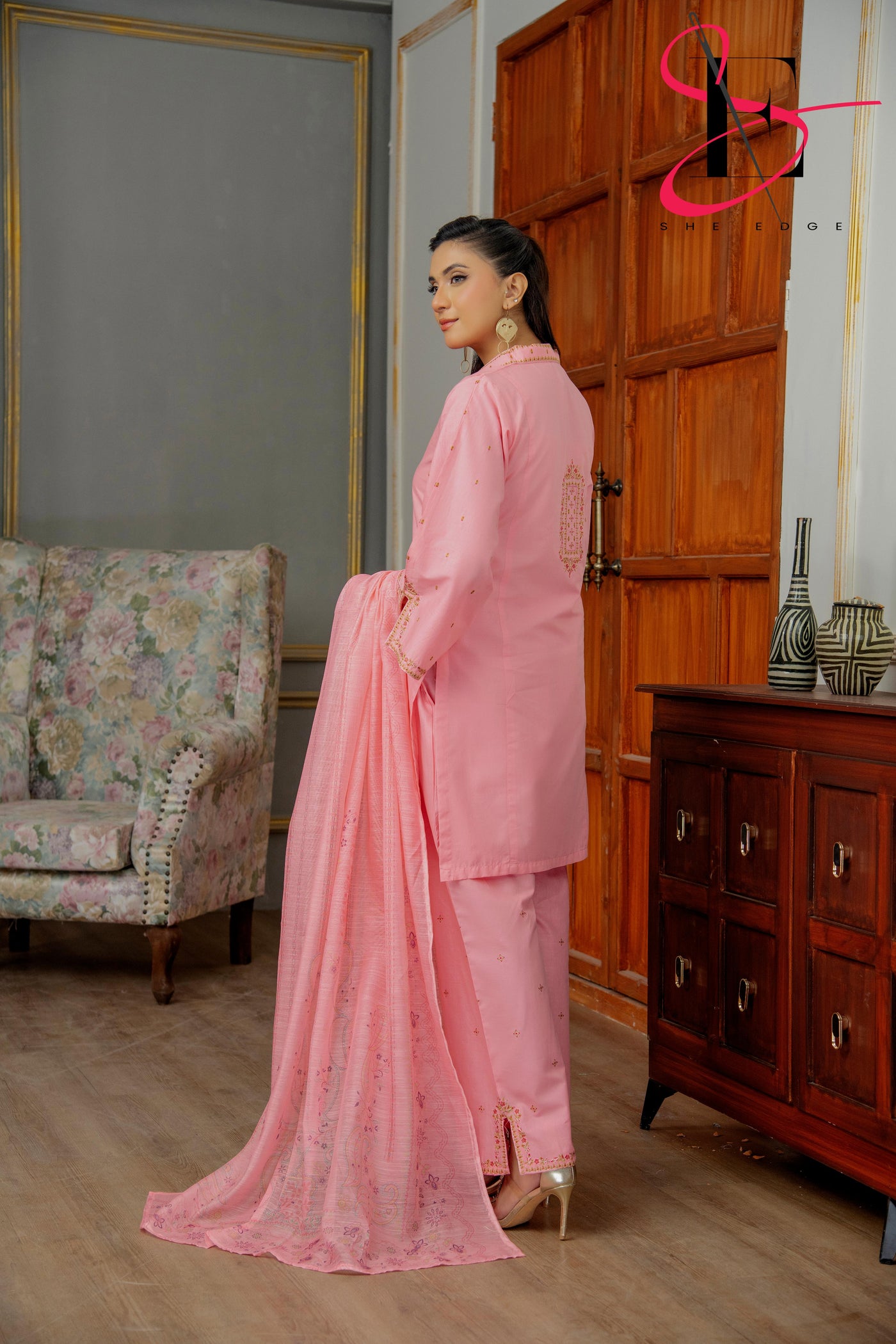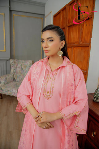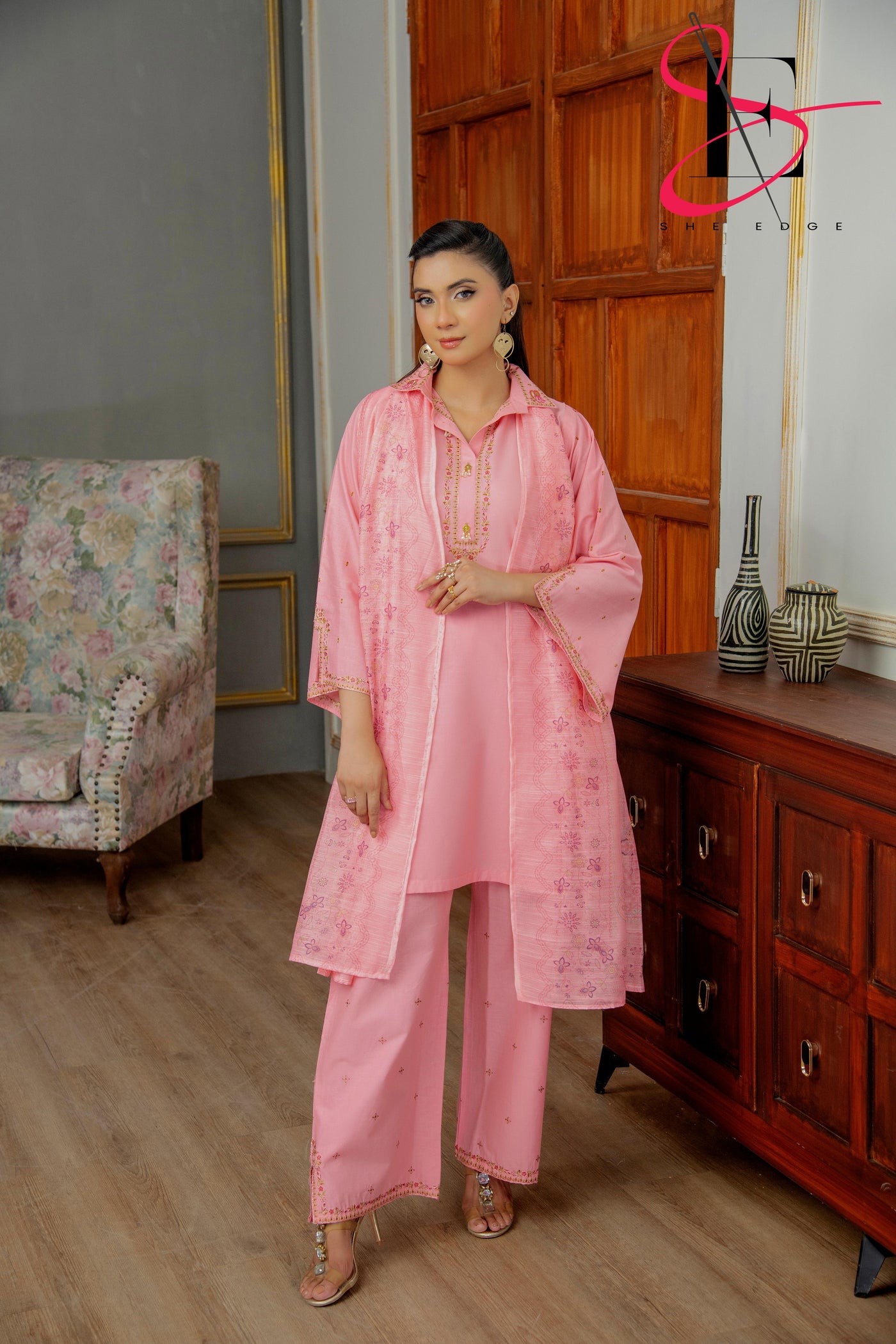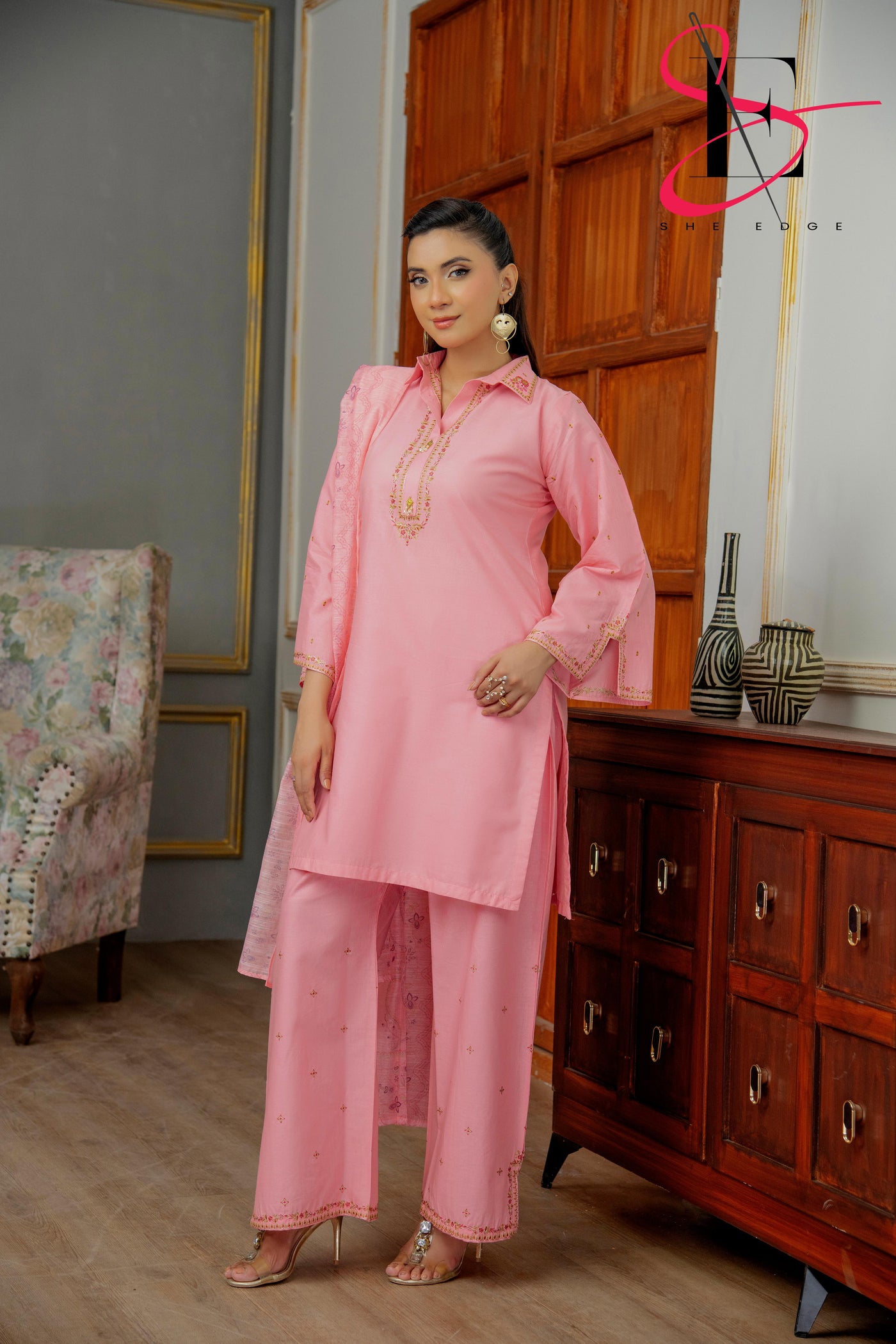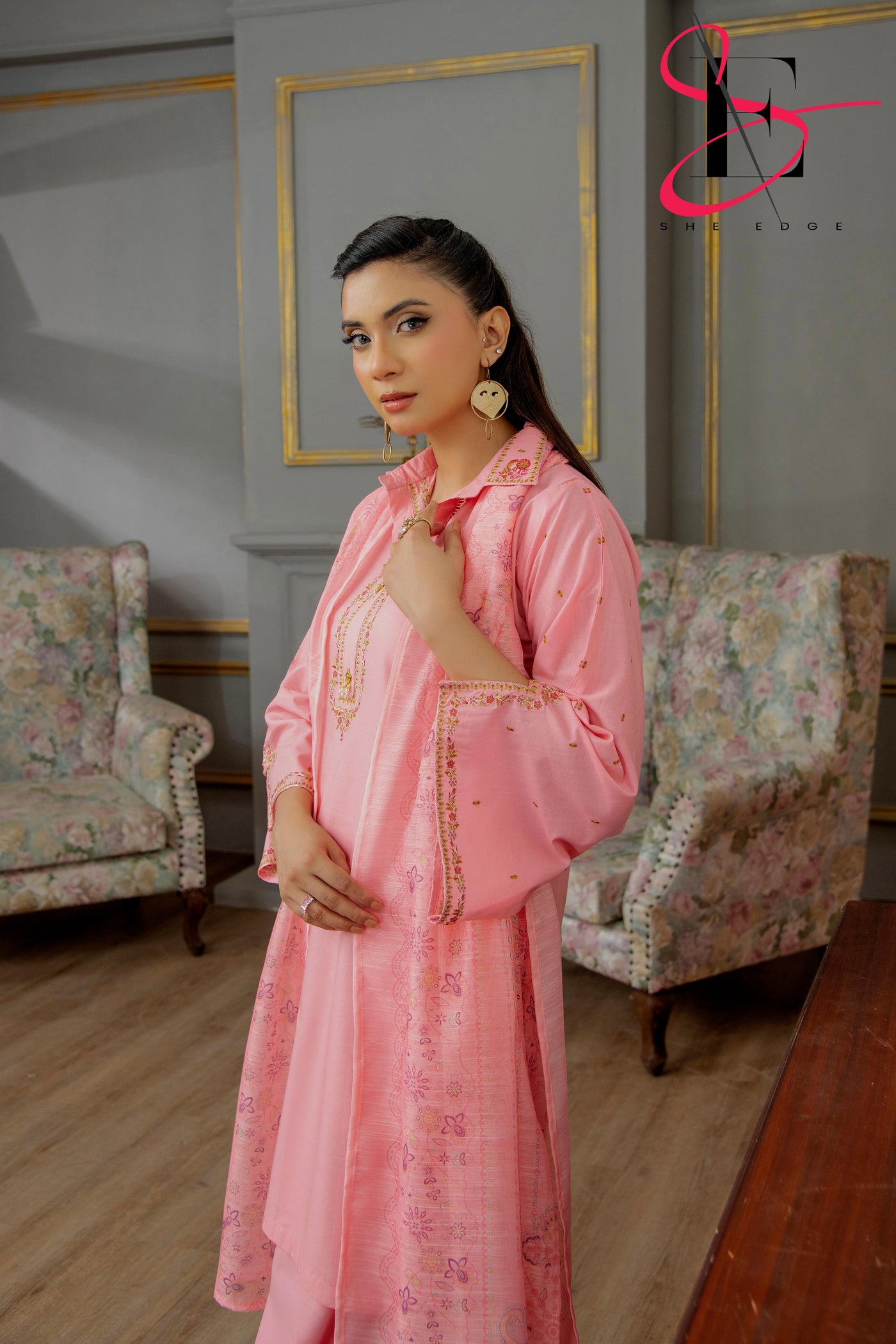 This 3-piece pink ensemble captures the essence of feminine charm with intricate detail and playful color.