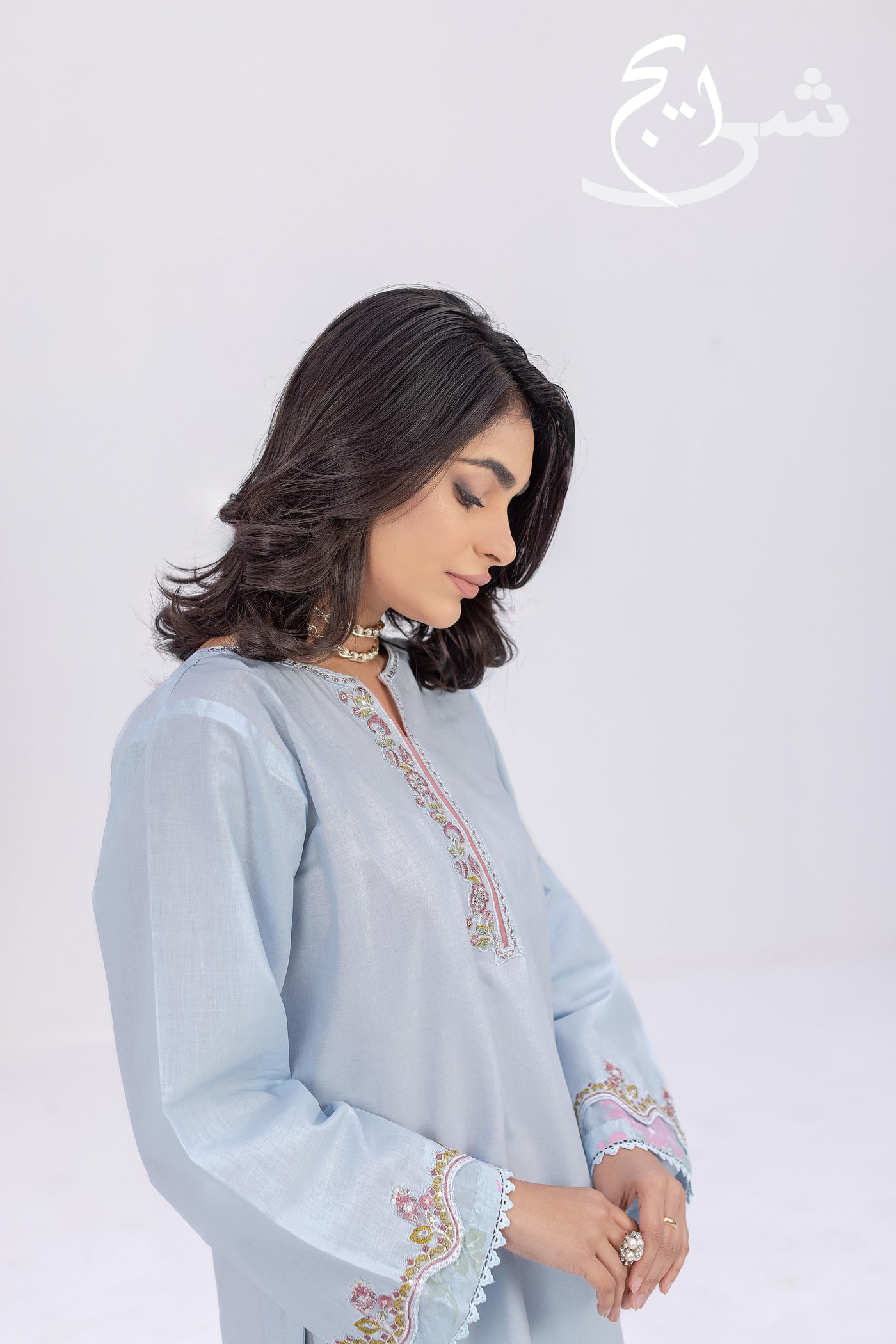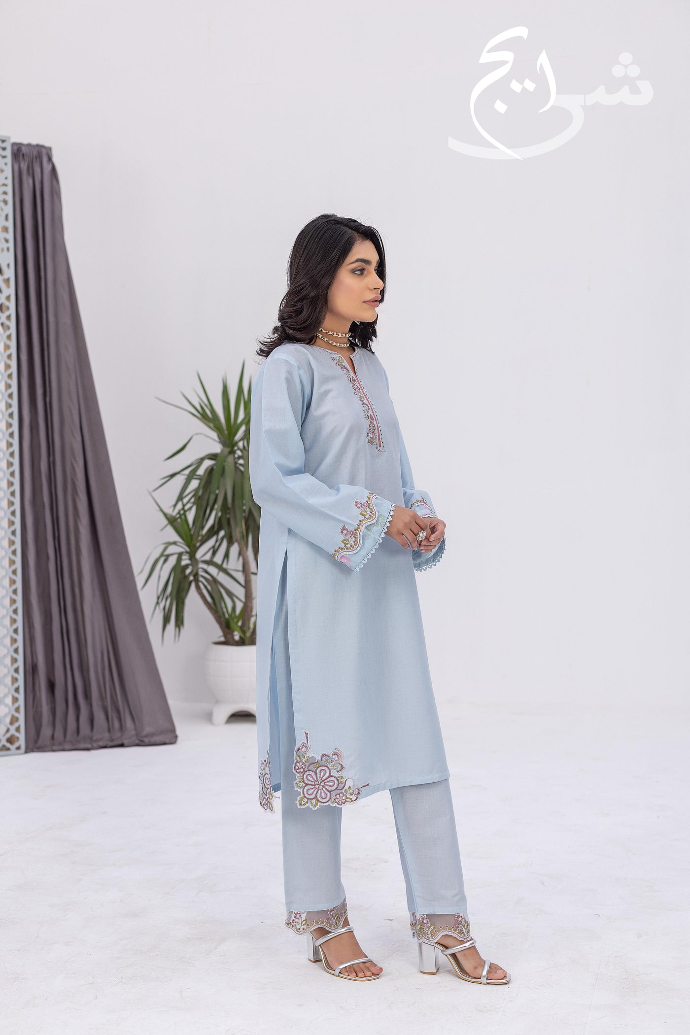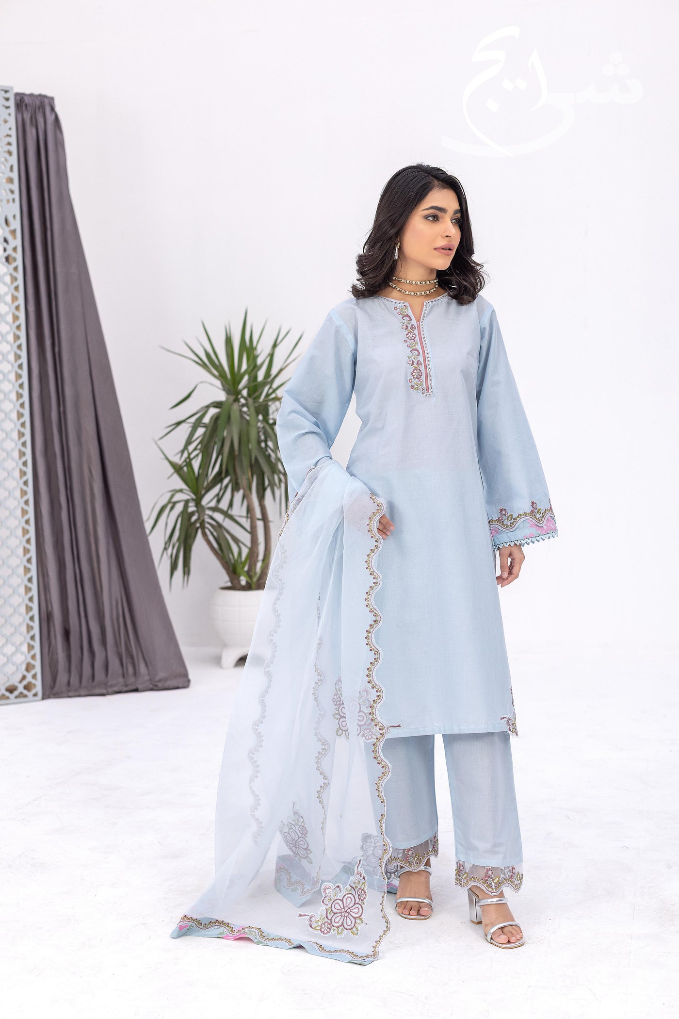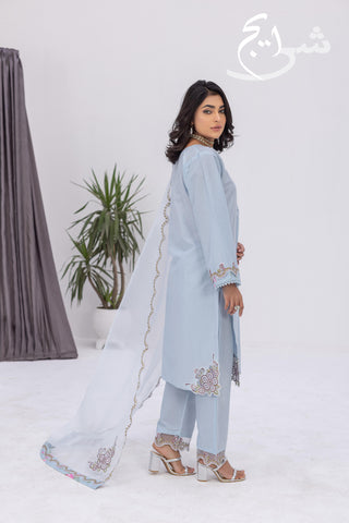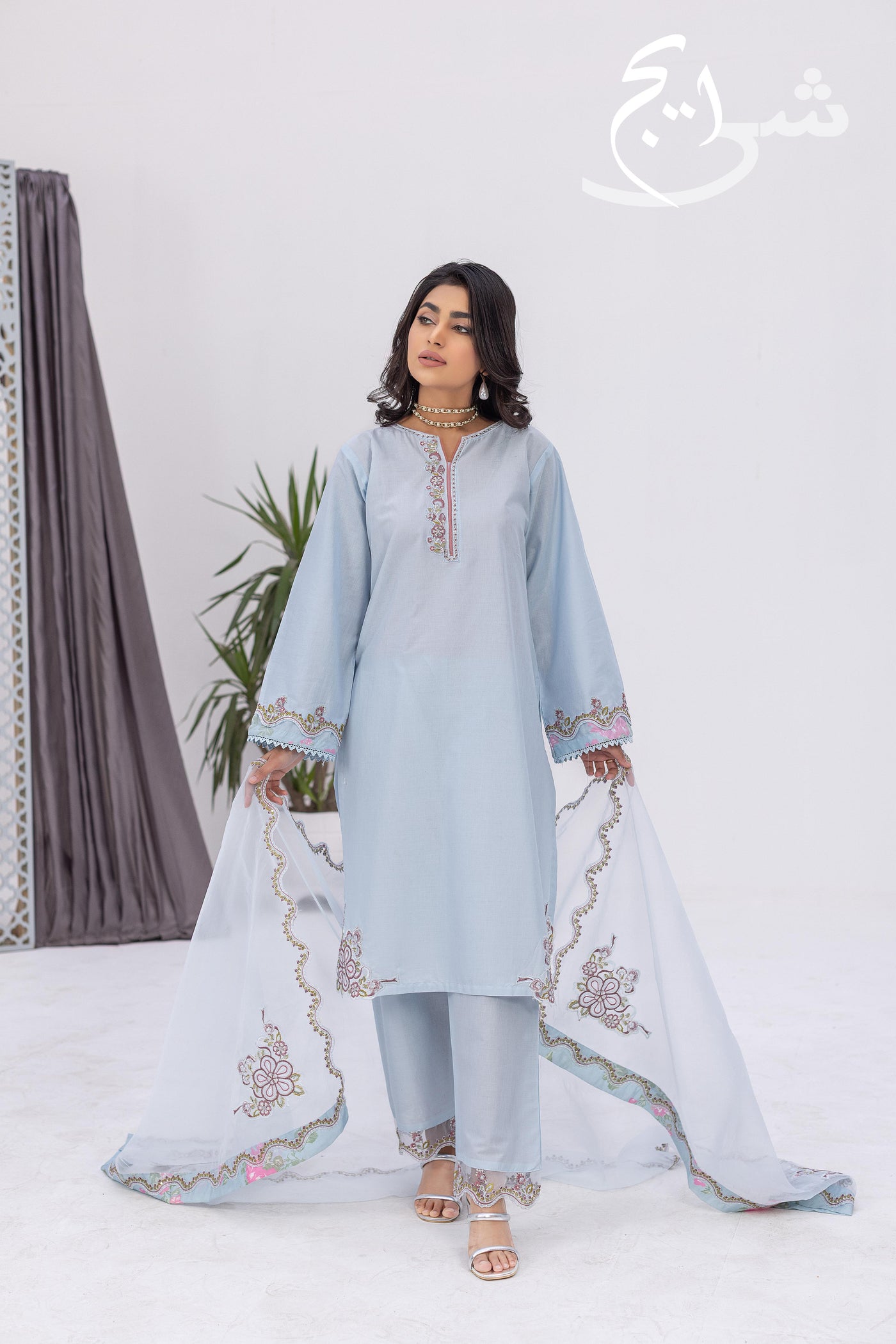 Bring a bold festive glow to your summer wardrobe with this standout 3-piece ethnic embroidered suit in a sky blue—crafted to feel light, graceful, and celebration-ready. The embroidered shirt features refined detailing that instantly elevates the look, paired with a perfectly coordinated embroidered trouser for a polished, premium finish from top to bottom.