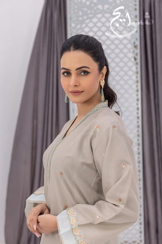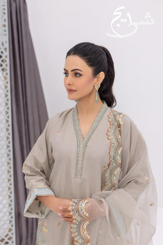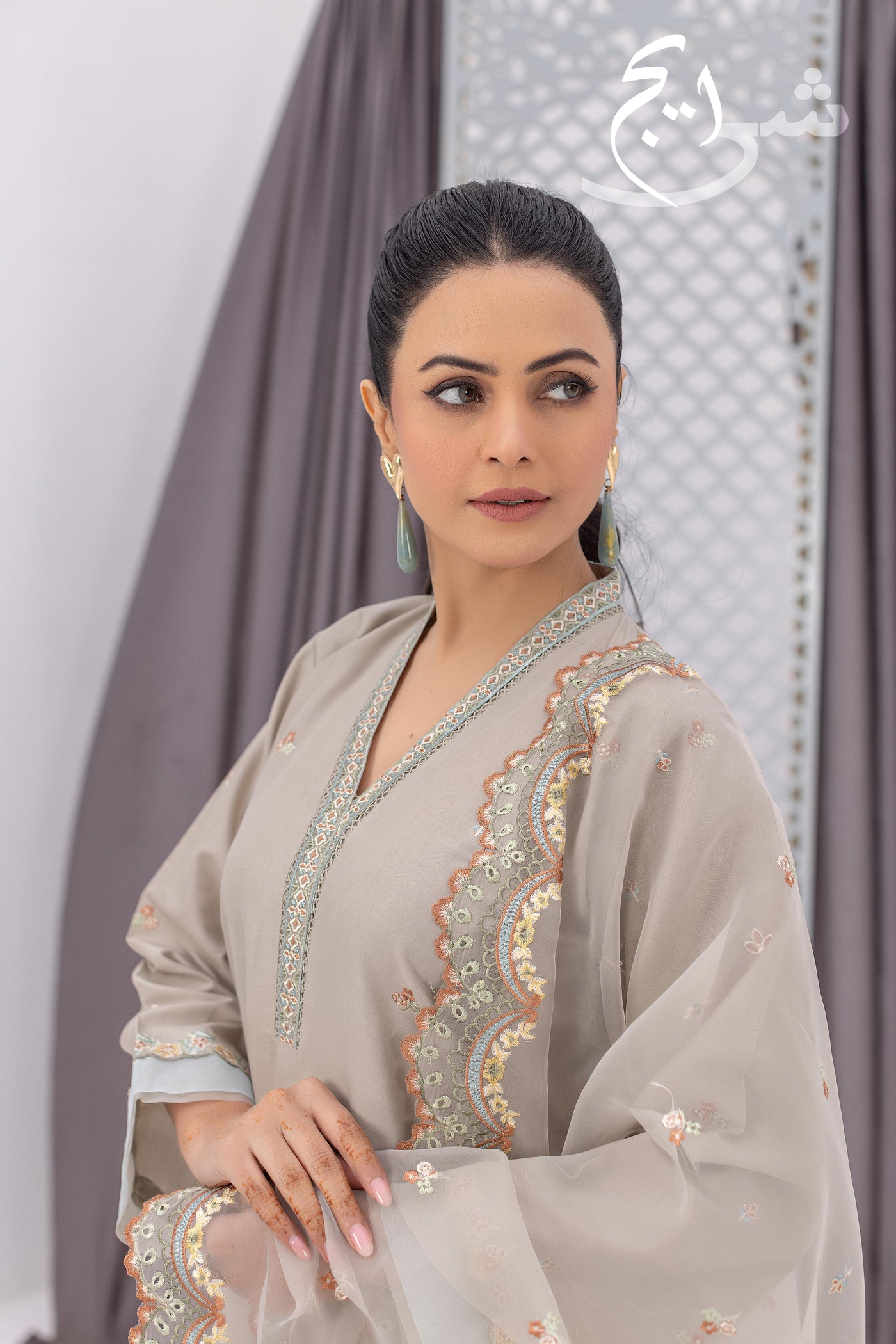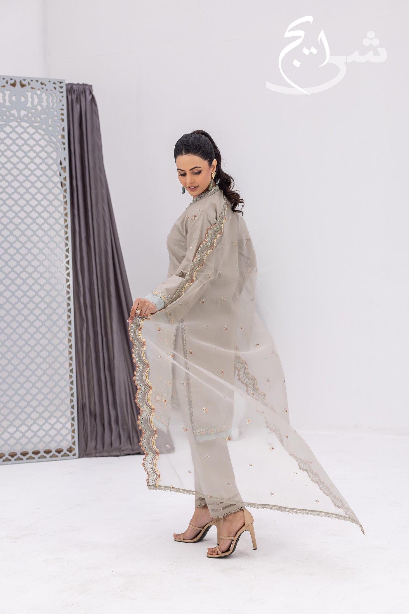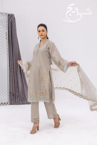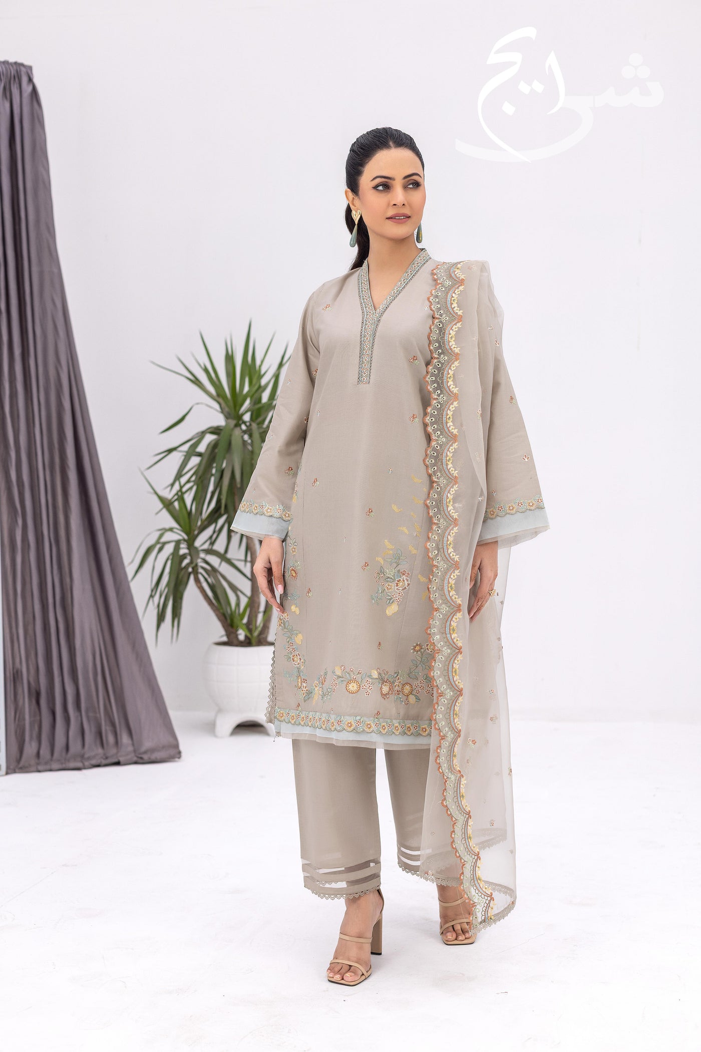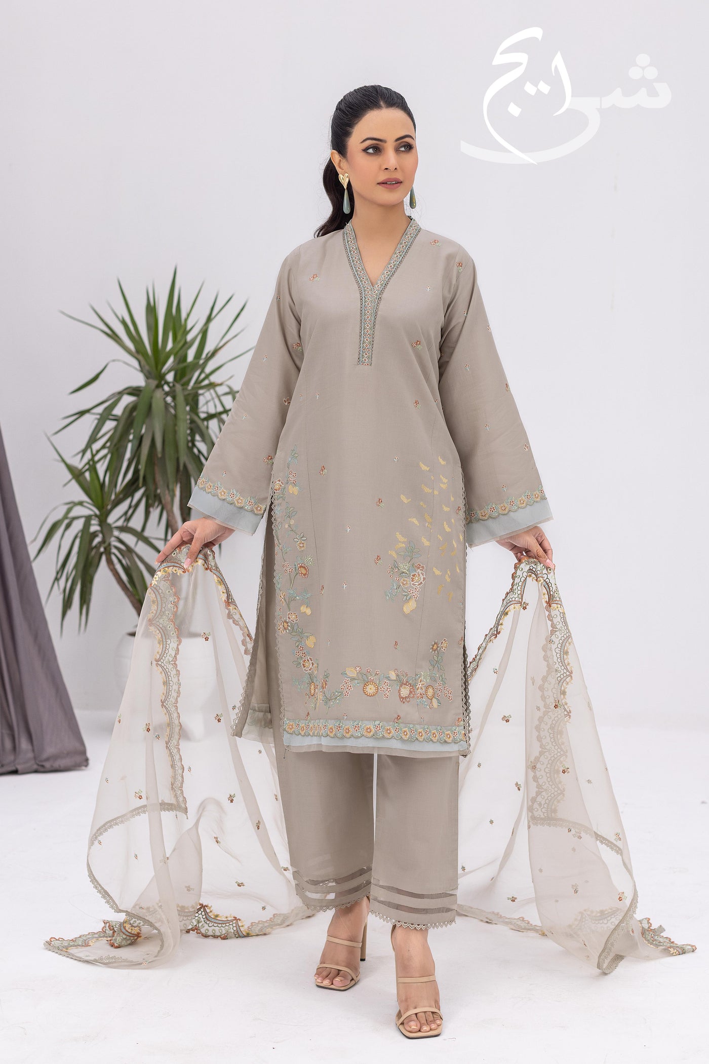 Bring a bold festive glow to your summer wardrobe with this standout 3-piece ethnic embroidered suit in a grey shade—crafted to feel light, graceful, and celebration-ready. The embroidered shirt features refined detailing that instantly elevates the look, paired with a perfectly coordinated embroidered trouser for a polished, premium finish from top to bottom.