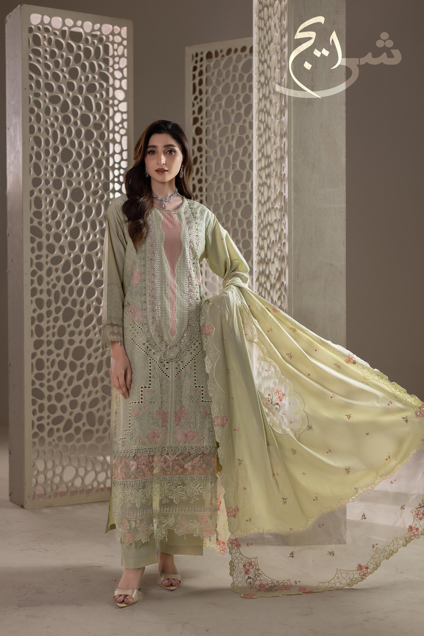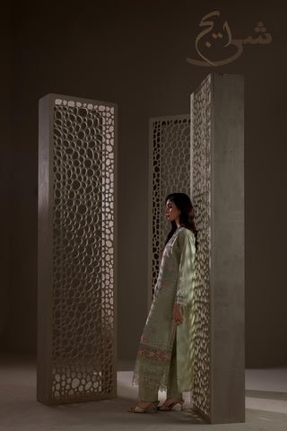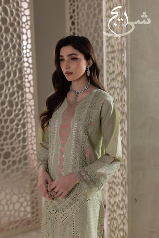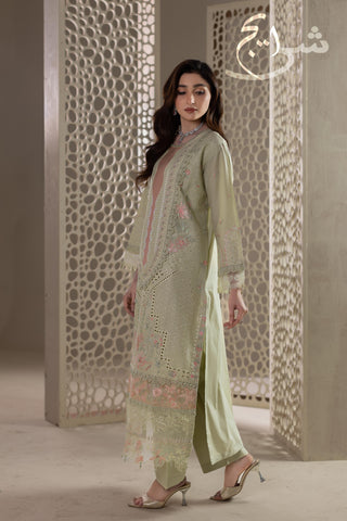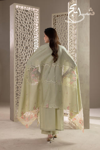 Summers Premium ’26 | Luxury Embroidered 3PC Suit in a refreshing Pistachio Green—crafted in breathable cotton lawn for a light, premium summer feel. The shirt is fully embroidered on the front and back, finished with hand embellishments that add an elegant, luxe touch without looking heavy. Paired with a simple plain trouser for clean balance and all-day comfort, and completed with an embroidered cutline dupatta that elevates the full look.