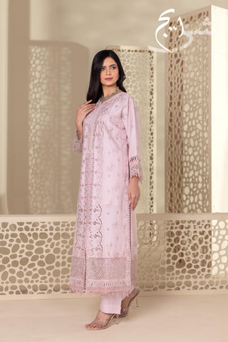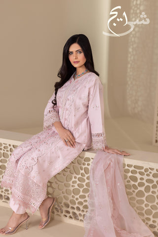 Summers Premium ’26 | Luxury Embroidered 3PC Suit in a soft, elegant Tea Pink—crafted in breathable cotton lawn for a light, premium summer feel. The shirt is fully embroidered on the front and back, finished with hand embellishments that add an elegant, luxe touch without looking heavy. Paired with a simple plain trouser for clean balance and all-day comfort, and completed with an embroidered cutline dupatta that elevates the full look.